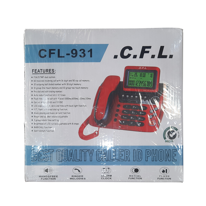 تلفن رومیزی سی اف ال CFL 931 در رنگ های زرد آجری/ قرمز/ سیلور عرضه شده و دارای گارانتی می باشد؛