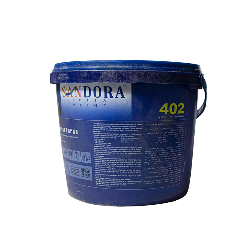 رنگ نیم پلاستیک1 (سان پلاستیک 402) ساندورا SANDORA در حجم های پنج، دوازده و بیست و پنج کیلو می باشد؛
